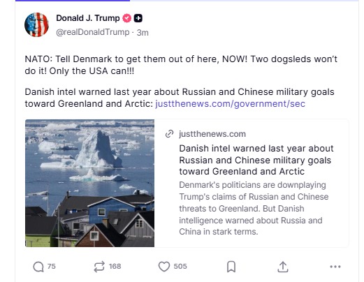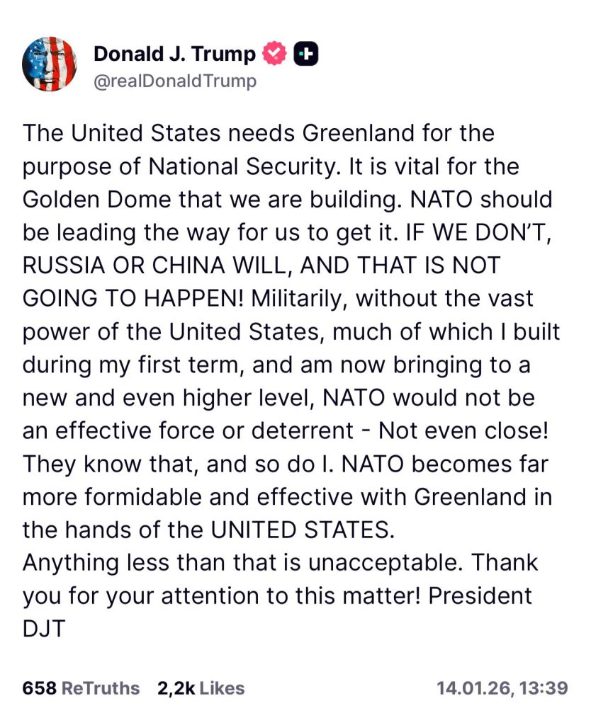 „Statele Unite au nevoie de Groenlanda pentru Securitatea Națională. Este vitală pentru Sistemul Golden Dome pe care îl construim. NATO ar trebui să ne conducă calea pentru a o obține. DACĂ NU O FACEM, RUSIA SAU CHINA O VOR FACE, ȘI ASTA NU SE VA ÎNTÂMPLA!