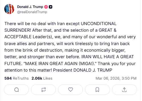„Nu va exista niciun acord cu Iranul în afară de CAPITULAREA NECONDȚIONATĂ! După aceea, și după selectarea unor LIDERI MARI ȘI ACCEPTABILI, noi, împreună cu mulți dintre aliații și partenerii noștri minunați și foarte curajoși, vom lucra neobosit pentru a readuce Iranul înapoi de la marginea distrugerii, făcându-l economic mai mare, mai bun și mai puternic decât oricând înainte. IRANUL VA AVEA UN VIITOR MARE. „FĂ IRANUL MARE DIN NOU (MIGA!).” Vă mulțumesc pentru atenția acordată acestei chestiuni!” a scris Președintele american Donald Trump pe Truth Social.