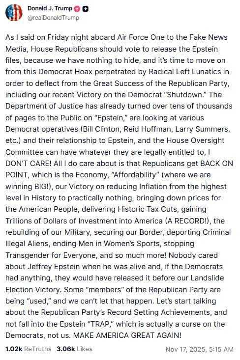 „Așa cum am spus vineri seara, la bordul Air Force One, către Mass-Media Mincinoasă, republicanii din Camera Reprezentanților ar trebui să voteze pentru a elibera fișele Epstein, pentru că nu avem nimic de ascuns, iar acum este momentul să mergem mai departe de această Înscenare Democrată pusă la cale de Lunaticii Radicali de Stânga, ca să distragă atenția de la Marea Reușită a Partidului Republican, inclusiv de la Victoria noastră recentă în legătură cu „Închiderea” Democrată.