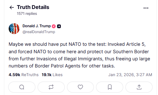 Noile atacuri la adresa NATO vin după ce, la Davos, Trump a reiterat ideea că „SUA ar sări oricând în ajutorul NATO”, însă „nu e sigur că și NATO ar sări în ajutorul SUA, dacă ar avea nevoie”.