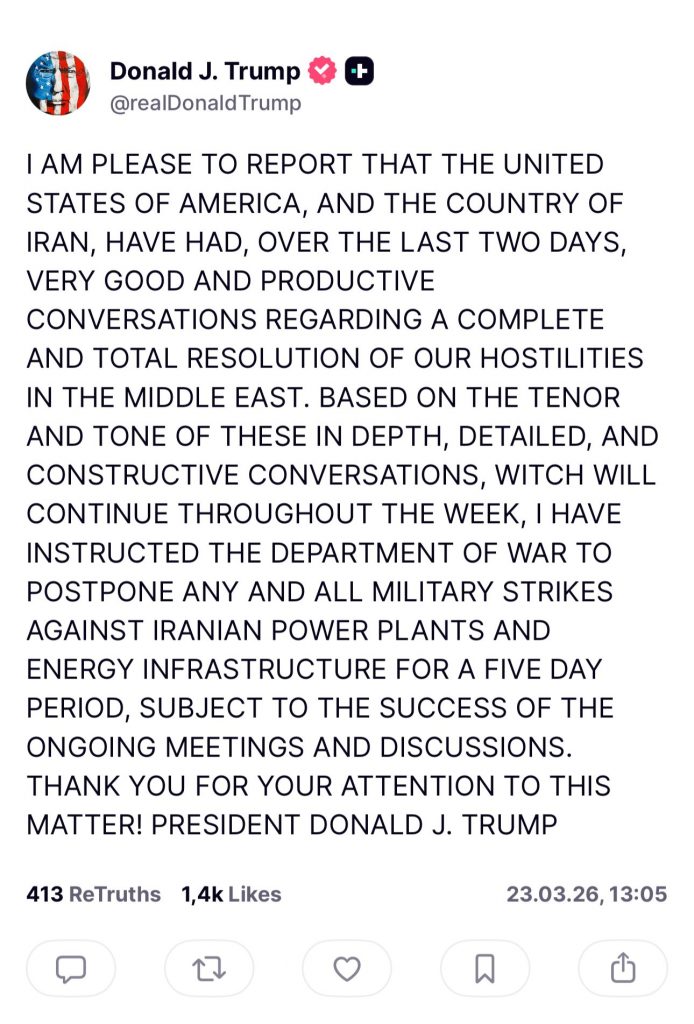 Președintele Statelor Unite, Donald Trump, anunță că SUA și Iran au avut discuții „foarte bune și productive” în ultimele două zile privind o posibilă rezolvare completă a conflictului din Orientul Mijlociu. Ca urmare, Washington a decis să amâne orice atac asupra infrastructurii energetice iraniene pentru o perioadă de cinci zile.