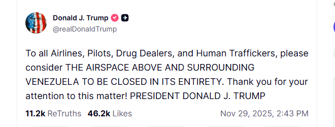 Într-o postare pe Truth Social, Trump a scris: „Către toate companiile aeriene, piloții, traficanții de droguri și traficanții de persoane, vă rugăm să considerați SPAȚIUL AERIAN DEASUPRA ȘI DIN JURUL VENEZUELEI CA FIIND ÎNCHIS ÎN ÎNTREGIME”.