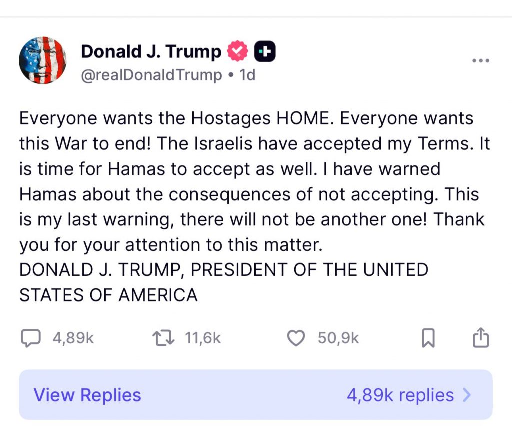 „Toată lumea vrea ostaticii ACASĂ. Toată lumea vrea ca acest război să se termine! Israelienii au acceptat Termenii mei. Este timpul ca și Hamas să accepte. Am avertizat Hamas despre consecințele neacceptării. Acesta este ultimul meu avertisment, nu va mai exista altul! Vă mulțumesc pentru atenția acordată acestei chestiuni”, a transmis Trump ieri.