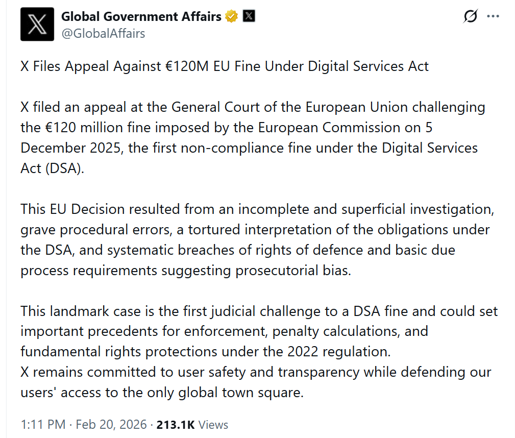 X a introdus o acțiune la Tribunalul Uniunii Europene împotriva amenzii de 120 de milioane de euro aplicate de Comisia Europeană la 5 decembrie 2025, prima amendă pentru neconformitate aplicată în temeiul Legii privind serviciile digitale (DSA).