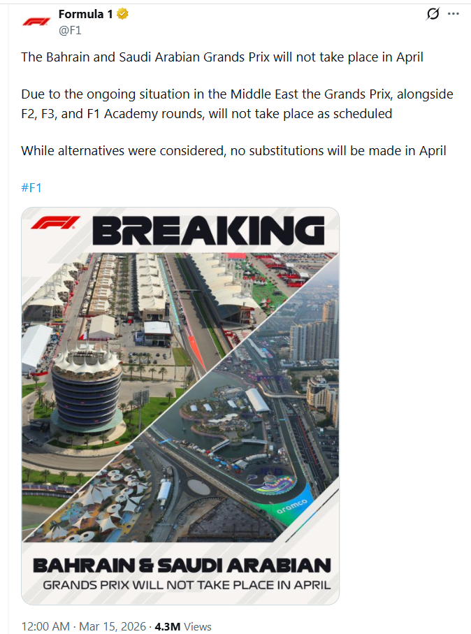 „Din cauza situației din Orientul Mijlociu, cursele nu vor avea loc conform programului”, a transmis Formula 1 într-un mesaj publicat pe platforma X.